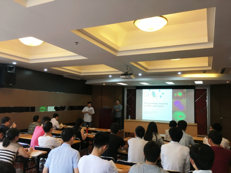 游凌冲教授围绕合成生物学中的基因线路设计,工程化细菌与生物材料的巧妙结合,细菌组装穹顶结构设计压力感受器,以及最近正在研究的微生物抗生素抗性基因传播新机制等方面进行了详细的讲解,与参会师生进行深入的探讨,并对美国杜克大学以及生物医学工程系的基本情况、招生数量、要求及奖学金等进行了详细介绍。游凌冲教授的讲解深入浅出,通俗易懂又充满乐趣,在座的教师与同学们都获益匪浅。