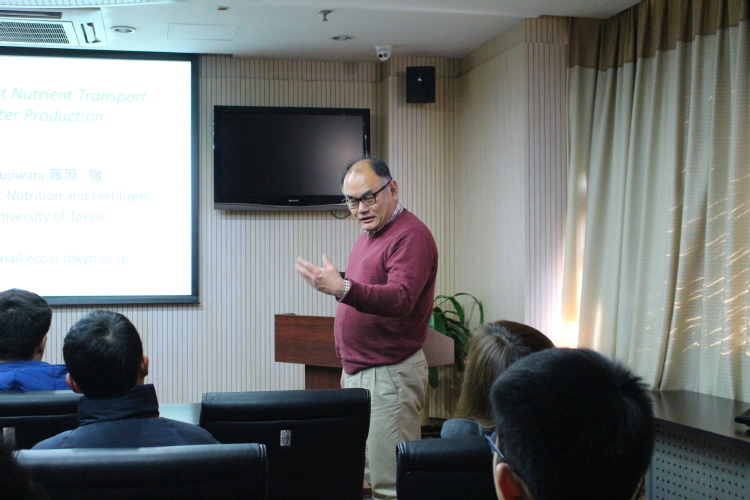 藤原徹教授首先向我们介绍了教授所带团队的研究方向。紧接着介绍了植物整个生长期内所必需的营养元素:碳氢、氧、氮、磷、钾、钙、镁、硫、铁、锰、锌、铜、钼、硼、氯等16种,并结合其实验室的研究进展,藤原徹教授对硼、镁两种元素展开了具体讨论,主要以拟南芥和水稻为研究对象,研究转运硼,镁等营养元素在植物细胞膜上的转运蛋白的功能和转运机制。藤原徹教授在植物营养吸收的研究,对当前实验室水稻抗性研究及壳寡糖吸收机制研究具有很强的指导意义。