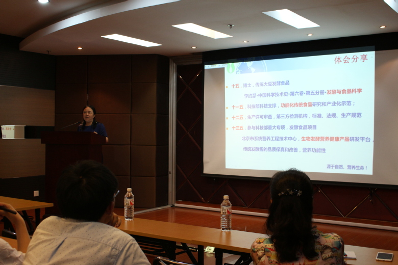 报告会上,鲁绯研究员以“中国传统发酵调味食品”为主题,先是引用大量古籍文献典故,以通俗易懂的语言,介绍了酱的历史渊源,如酱命名的由来、酱在各朝各代的运用、酱原料的变化、酱制作工艺的发展,由此展开了豆豉、天培、纳豆、豆酱、酱油、腐乳等相关发酵调味食品的介绍,包括其历史由来、发展进程、制作工艺和当代商业化产品。鲁绯研究员在报告过程中穿插许多富有生活气息的案例使得报告会气氛活跃,也让在场师生更易理解,对比了我国南北方传统发酵调味食品的异同令报告更具吸引力。