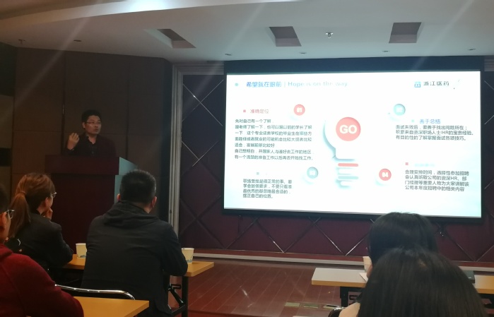 本次活动首先邀请了上海透景生命科技股份有限公司应用工程部总监张晓锋从“我是怎么面试”的角度,为准研究生们分享了在面试过程中需要注意的事项。随后,上海透景生命科技股份有限公司人事部容妍洁总经理以“求职经验分享”为题,从简历书写到面试细节问题等方面为大家做了相关经验分享。最后,浙江医药股份有限公司招聘主任唐仁喜总经理以“职步向前·相约在浙”为题,从秋招和春招的重要性、简历制作技巧和如何应对面试等方面,从企业角度为学生提供了求职参考。活动由 少妇白洁