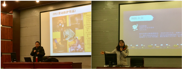 首要邀请陈继章做实验室安全教育的讲座。陈老师用幽默的语言和视频案例,讲解了实验室常见危险试剂的使用和存放问题,以及开展实验时应注意的细节和防范措施。他告诫学生实验前务必搞清实验的每一步骤,了解并做好相应的防护和应急措施,提醒学生化学品安全技术说明书(MSDS)的重要性,特别指出在实验过程中要“安全卫生,从心做起”。整个讲座内容丰富、讲解生动,学生们反响热烈、纷纷表示受益匪浅。