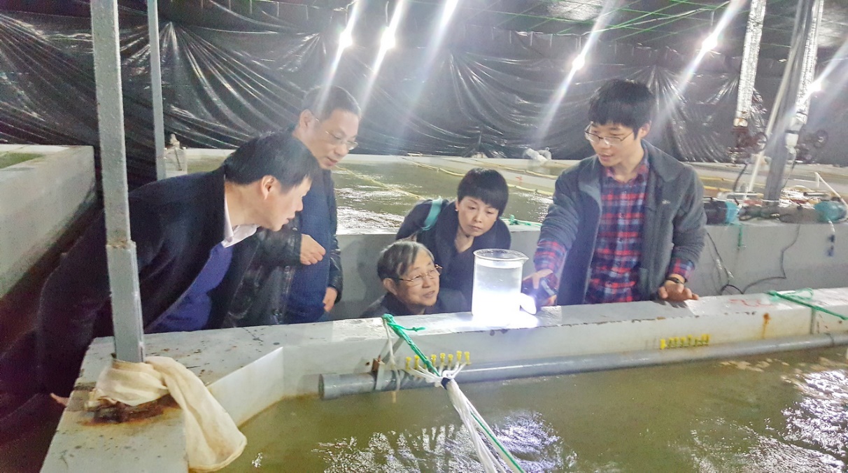 宁波市海洋与渔业研究院技术人员为张元兴教授等一行讲解大黄鱼种质培育情况