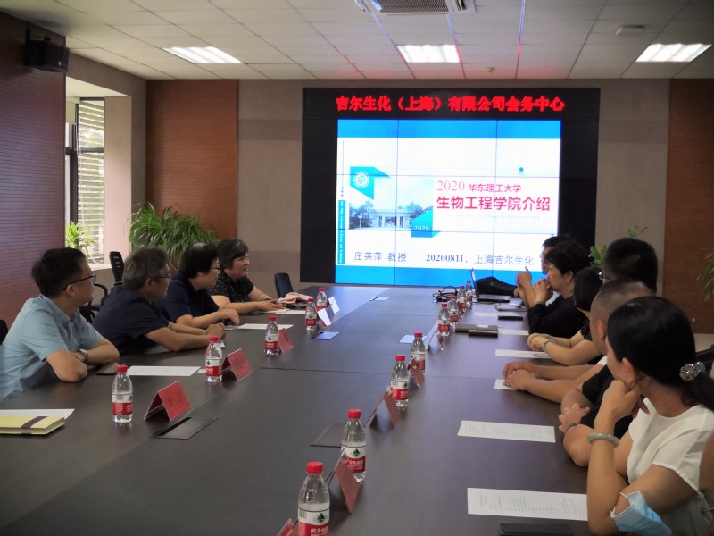 8月11日,生工学院院长庄英萍携应用生物学系主任吴海珍、生物工程系主任白云鹏等一行五人来到位于紫竹国家高新技术产业开发区的吉尔生化(上海)有限公司进行实践基地挂牌与交流。公司董事长徐红岩先生、总经理周敏女士、 少妇白洁