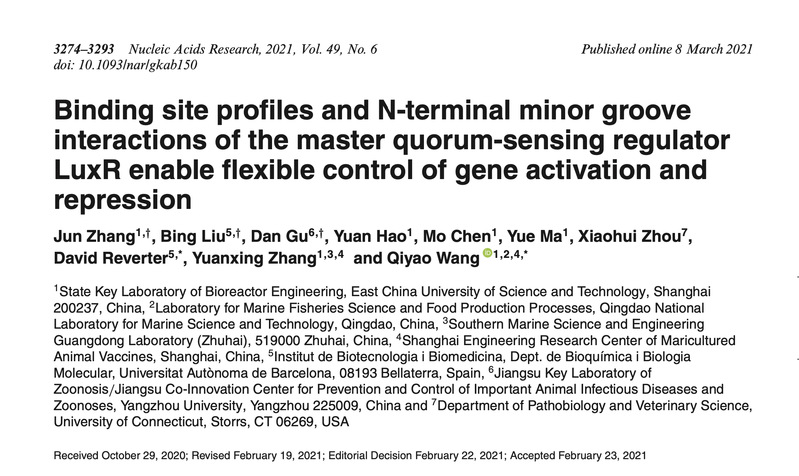 人与人之间可以通过语言、表情和动作进行交流。细菌菌体之间也能进行互相交流通讯,实现细菌的“社会性”行为,实现它们的共同目标,包括生物被膜、生物发光、运动性、营养代谢、毒力调节和环境适应性等。这种菌群交流通讯的机制称为群体感应 (Quorum sensing, QS) 系统。在海洋弧菌中存在复杂的群体感应系统,介导进行细菌种内和种间、细菌-藻类、细菌-动物宿主等多种信号交流机制,最终通过TetR家族的中枢调控元件LuxR蛋白同步控制下游多达600多个QS基因的表达,产生菌群行为。人们对LuxR蛋白同时调控诸多基因表达的机制一直不清楚。4月6日,国际知名的生化与分子生物学学术期刊Nucleic Acids Research发表了 少妇白洁