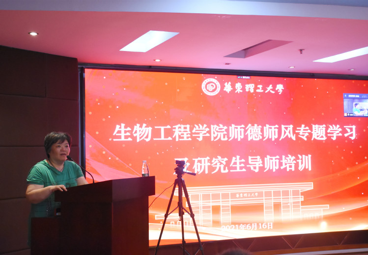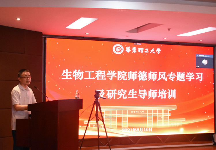 党委副书记陆兵主持。生物工程学院党政班子成员、研究生导师现场参加培训,其他教师通过腾讯会议在线参加。