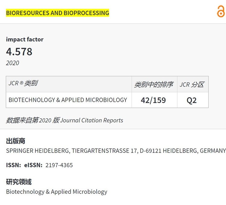 2021年6月30日,科睿唯安公司公布了2020年SCI收录期刊的最新影响因子,其中我校自主创办的英文期刊《Bioresources and Bioprocessing》(《生物资源与生物加工》,简称“BIOB”)经过近八年精心培育,正式获得了首个影响因子4.578,在生物技术与应用微生物学领域位居JCR Q2区前列,明年有望进入JCR Q1区。这标志着 少妇白洁