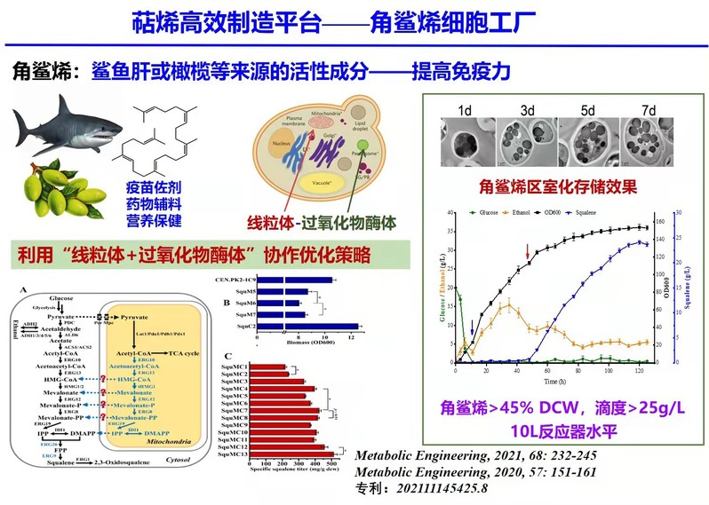 该工作系统研究了把酵母细胞动力室“线粒体”改造为萜烯合成车间的优势和问题,发现尽管线粒体具有前体和能量供应优势,但在萜烯合成过程中,其甲羟戊酸途径中有多个磷酸化产物对线粒体具有明显毒性。这些磷酸化的代谢产物在线粒体内可进一步转化为能量分子ATP的类似物,从而抑制与ATP相关的一些酶和功能,例如线粒体的氧化呼吸等,其中尤以甲羟戊酸-5-P和甲羟戊酸-5-PP的毒性最为明显,通过常规代谢工程策略难以有效消除这种毒性压力,严重制约了线粒体合成优势的发挥。该课题组在研究中发现,在线粒体中只合成到甲羟戊酸可显著促进菌体的生长,而在细胞质中强化甲羟戊酸可达到类似效果,且可在很大程度上抵消甲羟戊酸途径中毒性代谢产物对线粒体的压力。因此,提出了一种细胞质工程和线粒体工程相组合的双工程策略,成功减轻了线粒体区室化合成萜烯的代谢负担,更为重要的是该策略对于萜烯的生产具有细胞质工程和线粒体工程相叠加的效应。基于此,该课题组成功创建可以高产萜烯的平台型酵母细胞工厂——角鲨烯细胞工厂,产量达到了21g/L以上,是目前国际最高生产水平。