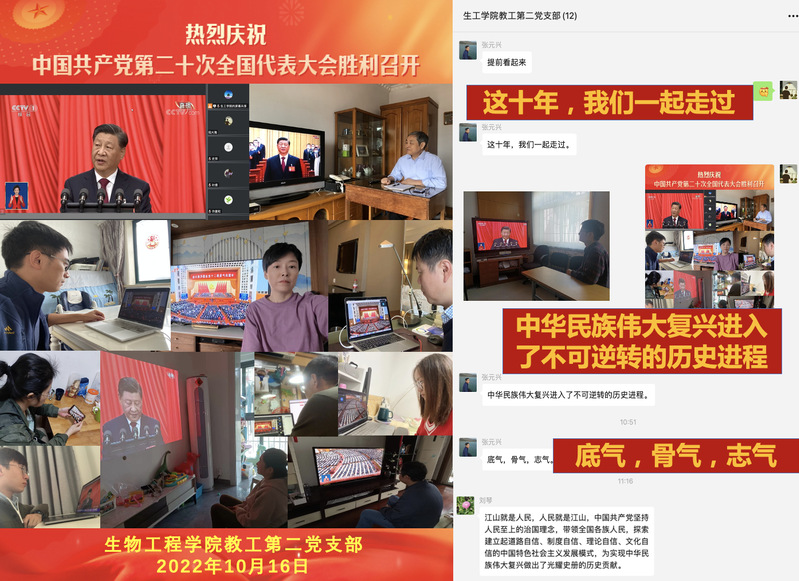 2022年10月16日上午,中国共产党第二十次全国代表大会开幕会举行,习近平同志代表第十九届中央委员会向大会作报告。在做好疫情防控的情况下,生工学院广大师生通过网络、电视等多渠道收看开幕会盛况,同时组织全体教工在腾讯会议室统一观看党的二十大开幕会,认真学习讨论党的二十大报告。