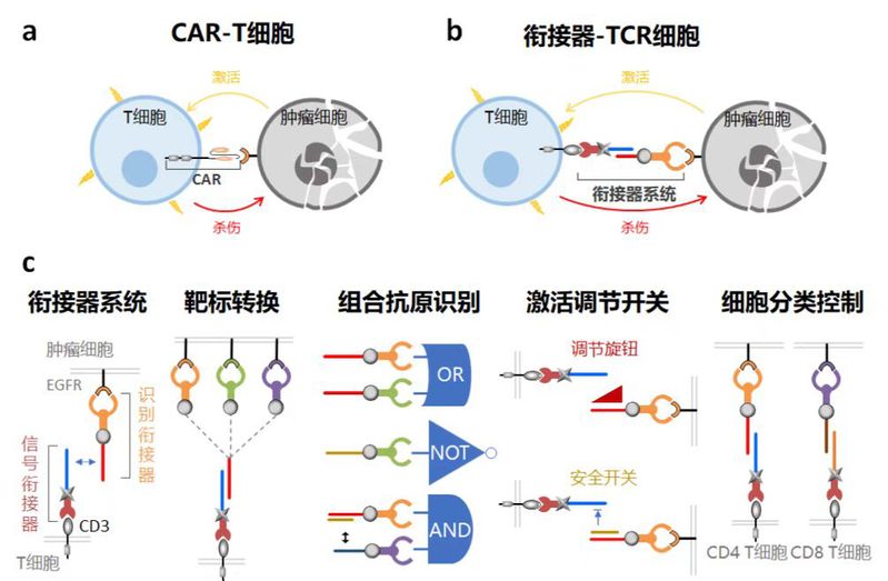 近些年,CAR-T细胞疗法通过基因工程表达嵌合抗原受体于T细胞表面,实现对肿瘤的特异性杀伤,成为极具前景的肿瘤治疗手段(图a)。但CAR-T疗法依然存在基因插入潜在风险,脱靶毒性(靶向特异性)和细胞因子风暴(响应强度)等问题,该工作构建了T细胞膜上的DNA生物纳米杂合衔接系统应用于工程化改造T细胞实现肿瘤免疫治疗,通过在细胞膜水平重编程T细胞受体,赋予其对肿瘤抗原的特异性识别及肿瘤细胞的特异性杀伤能力(图b)。该衔接系统通过模块组件快速组装,实现靶向性快速转换,降低改造成本,增强疗法的通用性;利用DNA链置换反应的灵活性和可设计性,完成多种抗原的组合识别,提高疗法的识别特异性,同时构筑激活调节开关,实现T细胞可控激活,防范细胞因子风暴等副反应;设计正交衔接组合,实现对不同类型T细胞的分类控制,提高疗效(图c)。荷瘤小鼠模型测试实验评估了衔接系统改造的T细胞临床应用潜力。本研究创新性的利用DNA纳米衔接装置改造T细胞表面天然受体,实现了对肿瘤抗原的特异性识别,规避了基因工程手段的潜在风险,改善了T细胞疗法适用性,安全性和有效性。