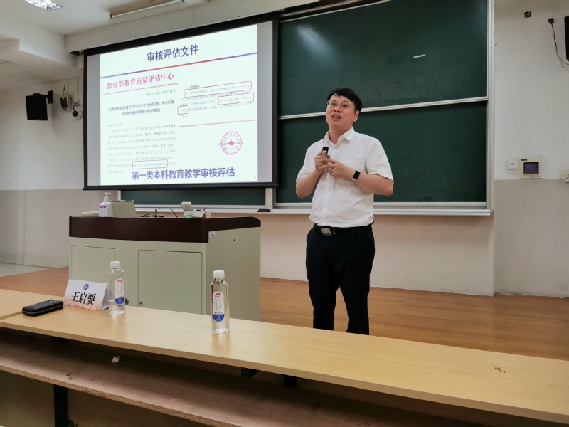 王启要从新一轮审核评估工作的背景、意义、主要特征、主要内容,十三五与十四五教学成果,学院本科教育教学问题讨论等方面,深入浅出地介绍了本科教育教学审核评估工作,并结合学院实际明确推进工作的时间点和具体方案,希望全院教师认真学习并了解本次评估的内容和要求,凝心聚力圆满完成各项评建任务。
