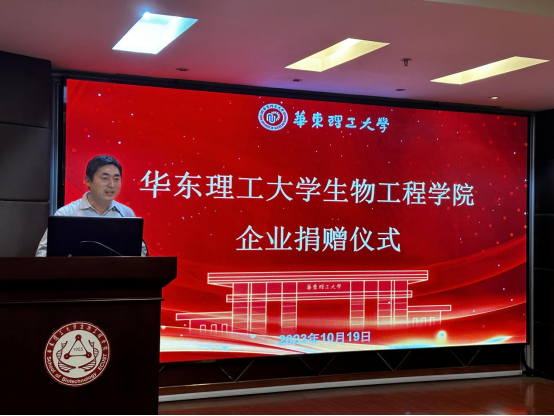 吴辉代表学院对南京金斯瑞生物科技有限公司慷慨捐赠表达了衷心的感谢。他表示,学院将不断提升与金斯瑞企业合作的质量和水平,进一步搭建好学院与企业间的桥梁,希望与金斯瑞在生物医药人才培养、科学研究和社会服务等方面与学院共谋发展、合作共赢,开创校企合作新局面。他强调,学院将更加积极主动对接国家重大战略需求,培养高层次、工程型、复合型领军人才,希望今天到会的教师和同学们,要肩负起“健康中国2030”的伟大使命,贡献磅礴的华理生工力量。