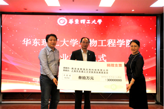 在捐赠方嘉宾、学校和学院领导以及师生代表的共同见证下,李建伟、吴辉代表受赠方接受了金斯瑞生物科技有限公司的捐赠,李建伟为金斯瑞生物科技有限公司代表梁艳颁发了捐赠证书。