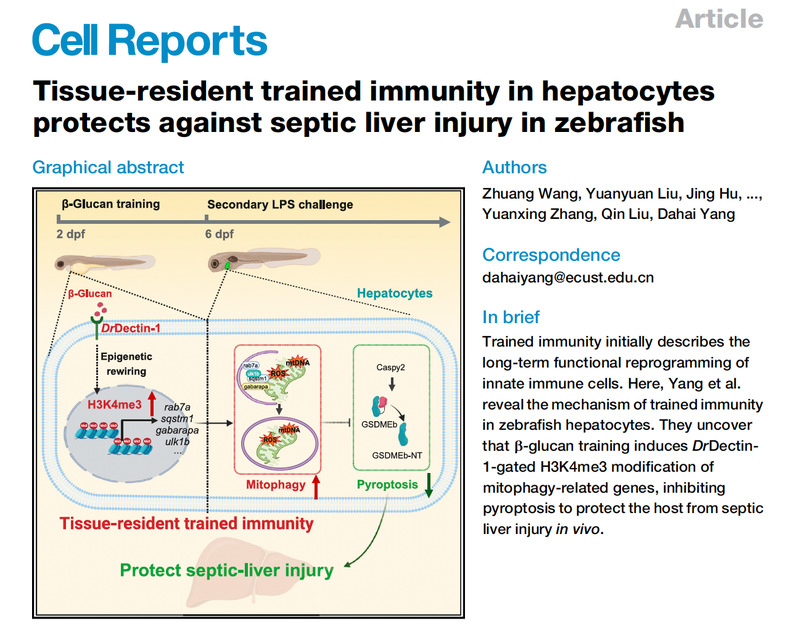 生物反应器工程国家重点实验室阳大海教授课题组在鱼类训练免疫激活缓解感染性肝损伤发生分子机制方面的最新研究成果。