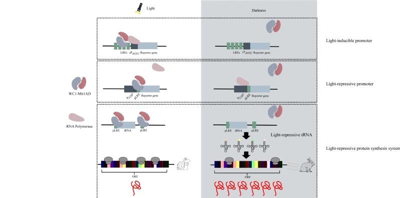 在粗糙脉孢菌中,蓝光传感器 WHITE COLLAR-1 (WC1)与WHITE COLLAR-2 (WC2)形成复合物(WCC),并与称为光响应元件(LRE)的特殊DNA序列呈现光照特异性结合。课题组将WCC与毕赤酵母内源转录因子融合设计,将LRE和内源核心启动子嵌合设计,分别构建了光诱导和阻遏型启动子。以GFP和荧光素酶为报告基因显示,光诱导型启动子调控严格,强度高于组成型启动子PGAP的70%。同时,课题组将以上设计应用于tRNA,构建了光阻遏型tRNA表达元件。在目标基因序列中设计“稀有密码子刹车”,通过光照对tRNA的表达调控实现对蛋白质翻译行为的调控,从而构建了光阻遏蛋白翻译系统。