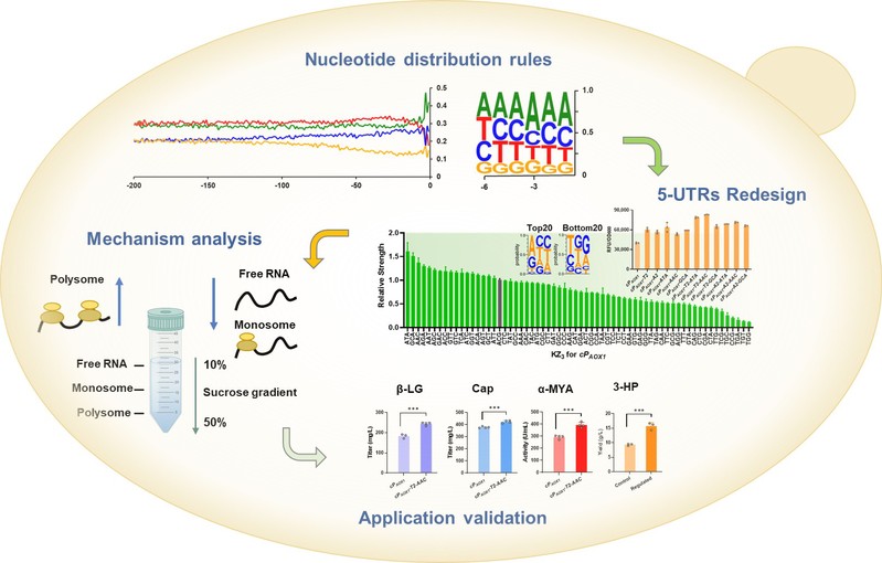 非常规酵母和丝状真菌作为重要的工业菌株,在制药、食品、生物炼制、酶制剂、化学品和生物材料等工业领域得到广泛应用。然而,这些菌株的深度重编程仍然受到遗传背景不清晰和分子工具不足的限制。尽管CRISPR-Cas9衍生技术有效解决了基因编辑问题,但灵活且精确的表达控制仍存在瓶颈限制。近年来,转录调控工具的开发已经极大丰富了真核生物的合成生物学元件库,但关于翻译水平调节的研究却相对很少。该研究提出了一种新策略,通过基于基因组规模的5'UTR核苷酸分布分析及重构设计,以精细调控酵母中的表达调控。