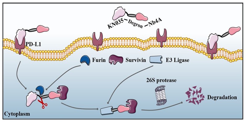 PROTACs是一种能够特异性降解目标蛋白的创新分子工具。与传统的小分子抑制剂相比,PROTACs可以降解细胞内的任何蛋白,包括那些难以成药的靶点。然而,传统PROTACs的非特异性分布可能导致正常组织中的蛋白降解,从而引发系统性毒性。为了解决这一问题,本研究引入了纳米抗体,并结合肿瘤微环境的特点,开发出了一种新型的双特异性纳米抗体降解平台—BumPeD。BumPeD平台的核心在于利用肿瘤微环境中高表达的Furin蛋白酶来激活蛋白降解过程。研究中设计了两种工作蛋白KVN和K14N,分别通过靶向PD-L1(细胞表面蛋白)和Survivin(细胞内蛋白)来实现对肿瘤细胞的精准打击。实验结果表明,这两种蛋白能够有效进入肿瘤细胞,并通过泛素-蛋白酶体途径降解Survivin蛋白,从而诱导肿瘤细胞凋亡,抑制肿瘤细胞的增殖和迁移。