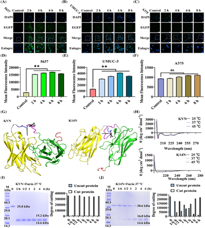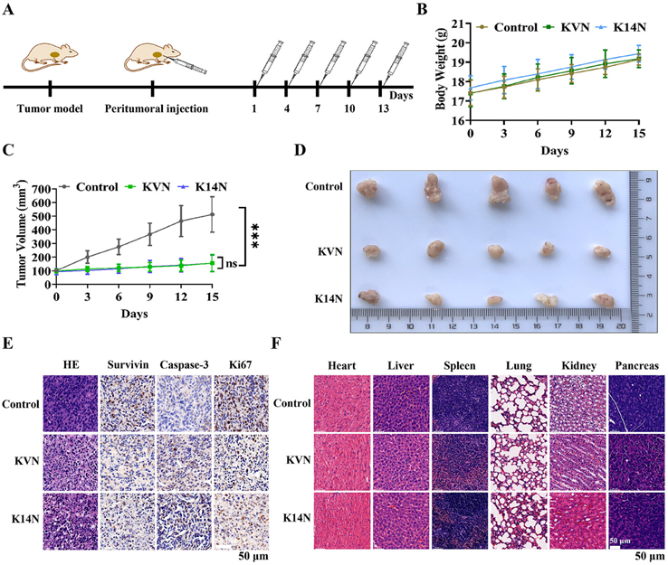 在体外实验中,KVN和K14N蛋白在高表达PD-L1的5637和UMUC-3细胞中表现出显著的抗肿瘤活性。通过荧光显微镜和流式细胞仪检测,研究者们发现这些蛋白能够高效进入细胞,并在细胞内释放降解Survivin蛋白的活性片段。进一步的3D肿瘤球实验也证实了KVN和K14N对肿瘤生长的抑制作用。在体内实验中,研究者们利用UMUC-3细胞构建了裸鼠肿瘤模型,并通过瘤周注射KVN和K14N蛋白。结果显示,这两种蛋白能够显著抑制肿瘤生长,且对小鼠的体重和主要器官未产生明显毒性。组织学分析表明,Survivin蛋白的降解导致了Caspase-3的积累,从而促进了肿瘤细胞的凋亡,同时Ki-67蛋白的下调也表明了肿瘤增殖能力的降低。这项研究不仅提供了一种全新的肿瘤靶向蛋白降解策略,还为开发新型降解药物提供了理论基础和实验支持。BumPeD平台的灵活性和可变性使其能够根据不同的肿瘤类型和靶点进行调整,为未来的个性化癌症治疗提供了新的方向。然而,该平台也面临一些挑战,例如纳米抗体的筛选和优化,以及如何进一步提高蛋白降解效率等问题。未来的研究将致力于解决这些挑战,并探索更多基于肿瘤微环境的创新治疗策略。总之,BumPeD平台的出现为癌症治疗带来了新的希望,也为靶向蛋白降解领域的发展注入了新的活力。