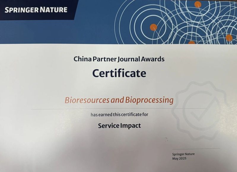 主办的学术期刊Bioresources and Bioprocessing (简称BIOB) 荣获“服务影响力奖” (Service Impact Awards)。该奖项旨在表彰期刊在服务学术共同体、推动领域发展以及提升国际影响力方面所作出的卓越贡献。