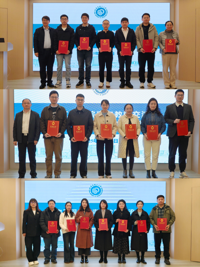 颁奖环节,程家高、叶邦策、钱嫦萍分别为2025年度“教学科研系列”“教辅实验系列”“管理(含辅导员)系列”的获奖教师颁发荣誉证书。获奖教师代表张敬宇、邹振平、李鹏飞、韩微微、梁心怡依次上台,分享他们在教学、科研、管理及育人工作中的心得体会。他们的发言真挚深刻,充分展现了对教育事业的热爱、对学生的责任感以及对岗位的坚守,生动诠释了教育家精神在学院的实践与传承。